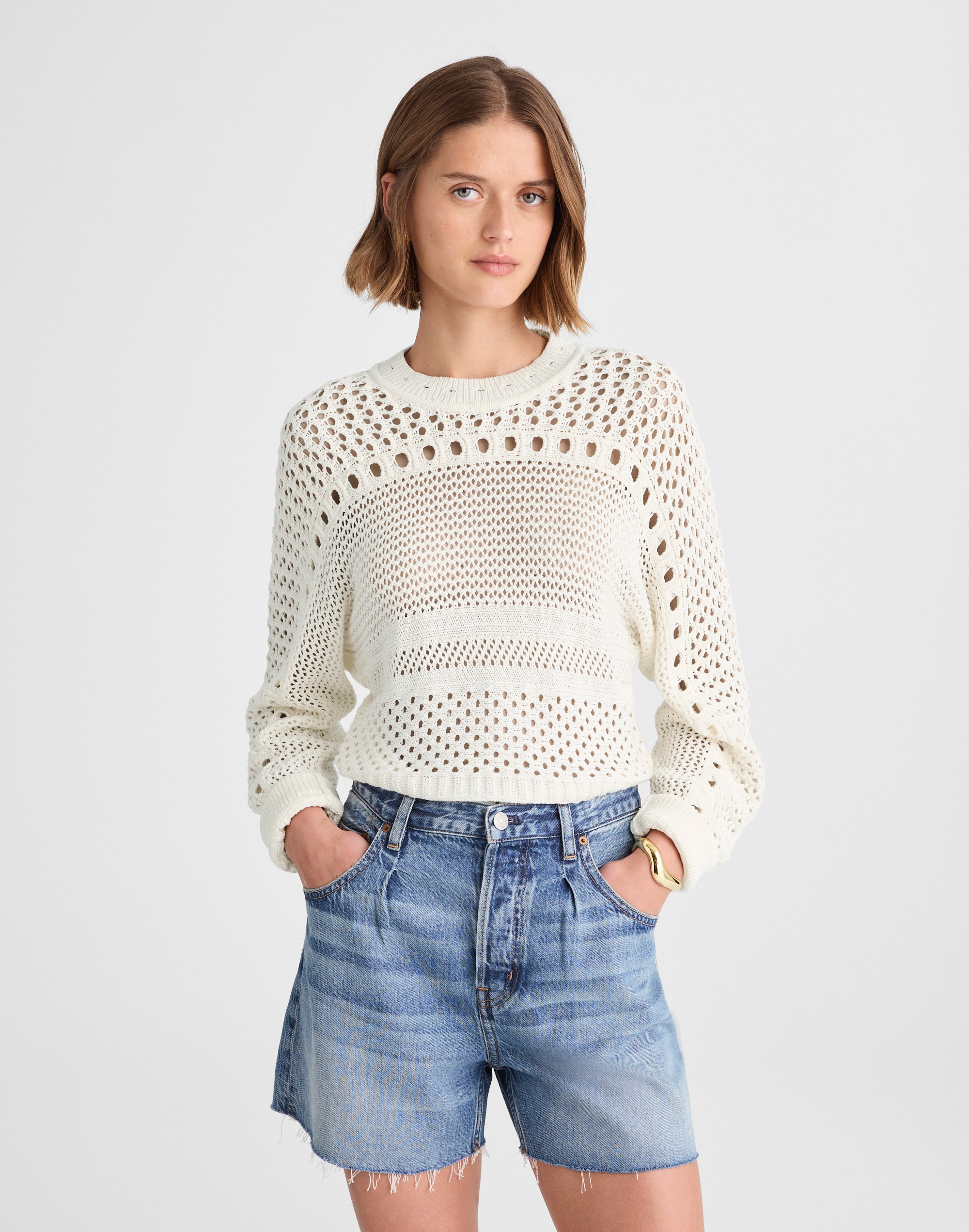 Open-Stitch Cotton Pullover Sweater